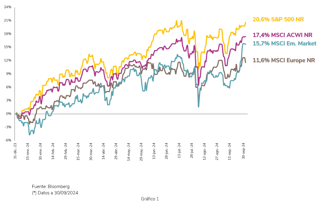 Septiembre cierra el siempre sorprendente periodo estival debido a su conocida y recurrente volatilidad. El verano de 2024 no ha decepcionado y las Bolsas han sufrido un "minicrash" a principios de agosto que, más tarde, se ha recuperado durante el resto del mes y posteriormente en septiembre. De todas maneras, los máximos del mercado del mes de julio no se han superado (ver Gráfico 1), aunque se han acercado mucho.