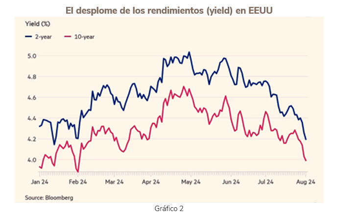 Para las decisiones de inversión, tal vez, lo verdaderamente relevante es simplemente anticipar que los tipos de interés oficiales (a corto plazo) descenderán casi un 2% en los próximos meses. Es mucho, y el rendimiento (yield) de los títulos de Deuda Pública han anticipado ya esta expectativa (ver Gráfico 2). Hay que recordar que el rendimiento baja cuando los precios suben.