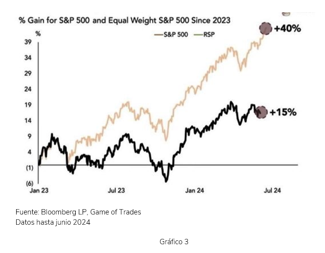 El Gráfico 3 pretende ilustrar que los múltiplos del índice S&P500 están muy influidos por un grupo muy reducido de compañías (7 Magníficos) (*). Si las eliminamos del cálculo, el PER de dicho índice pasa de 24,59x a 21,95x, más razonable. Pero recordemos, en todo caso, que el crecimiento de beneficios (BPA) de ese selecto grupo de compañías tecnológicas ha superado el 30% en el 2ºT2024, doblando el esperado a largo plazo.