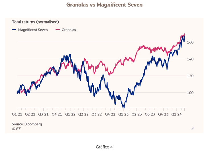 En los últimos 10 años tanto los 7 magníficos norteamericanos como las Granolas europeas han contribuido masivamente a los resultados de nuestras carteras (ver Gráfico 4). Naturalmente, ello ha sido así por un crecimiento fortísimo de los beneficios. ¿Va a proseguir? Nadie lo sabe con exactitud, pero esperamos que las compañías sigan creciendo aunque algunas no tanto como en los últimos años.
