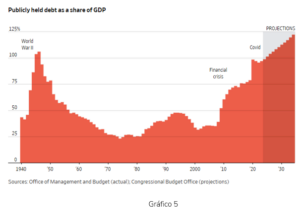 Esta cuestión se repite últimamente en nuestras reuniones con los clientes. El Gráfico 5 se explica por sí mismo y justifica la inquietud por la trayectoria imposible del volumen de Deuda en relación al PIB norteamericano (Deuda/PIB).