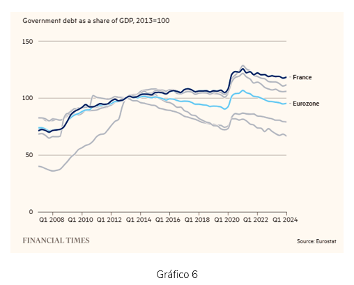 Lo mismo ocurre con otros países: el nuevo Gobierno en Francia debe afrontar un severo ajuste fiscal, siempre impopular (Gráfico 6) pues, siendo un país con impuestos elevados, el gasto en protección social supera ampliamente la media de la UE.