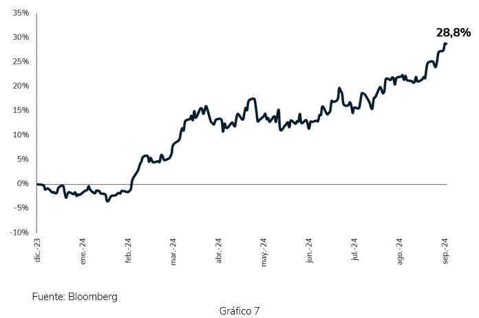 ¿Algún signo de inquietud por todo ello? Nos preguntamos si la subida del precio del oro en 2024 (ver Gráfico 7) no tiene sólo que ver con una política de prudente diversificación de las reservas de varios Bancos Centrales sino de cierta precaución ante este problema.