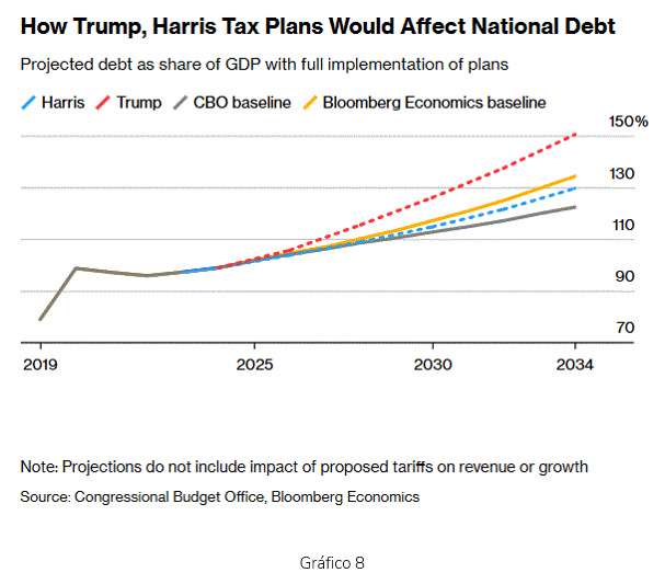 En todo caso, no parece que ninguno de los dos candidatos vaya a atajar el déficit público pues éste viaja a caballo del colosal programa de gasto público y subvenciones, que ha lanzado el Presidente Biden y las reducciones de impuestos de Donald Trump. Este ha prometido, no obstante, que si alcanza de nuevo la Presidencia, suprimirá la Inflation Reduction Act. Como es sabido, las promesas de los candidatos siempre se moderan tras alcanzar la victoria (ver Gráfico 8).