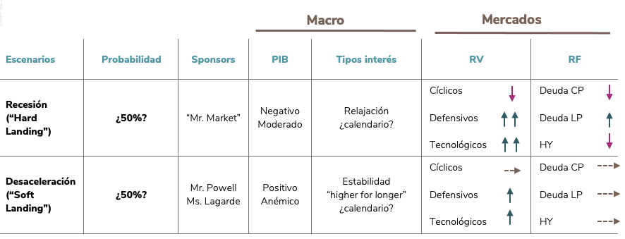 Sigue la habitual incertidumbre macroeconómica y su respuesta por los Bancos Centrales, lo que divide a economistas e inversores. El Cuadro 2 pretende servir de marco para el final de 2023 y, sobre todo 2024, pues parece que el ciclo se alarga sin definir ninguno de los dos escenarios que se recogen en el Cuadro.