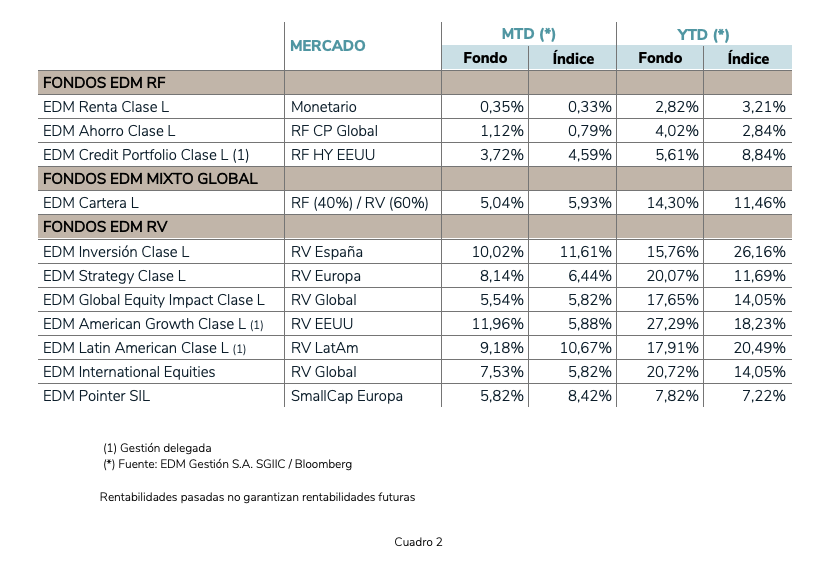 Esta perspectiva ha provocado un “rally” fenomenal, tanto en el mercado de Deuda (subida de precio con caída de rendimiento) como en los índices bursátiles y en las valoraciones de los Fondos EDM (ver Cuadro 2).