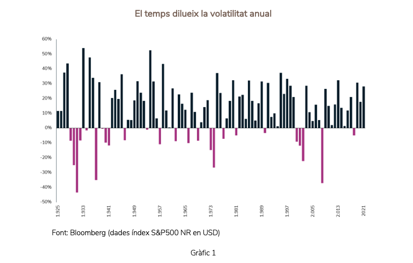 La conseqüència d’aquesta incertesa en els mercats financers ha estat una gran volatilitat, que pot ser una sorpresa per als inversors novells, però que és habitual en la història dels mercats. Tal com mostra el gràfic 1, els anys de resultat borsari negatiu representen només un percentatge baix del total, atès que la gran majoria ofereixen resultats positius: la història avala que el món no s’acaba. Aquest recordatori no pretén minimitzar les preocupacions del present, sinó només posar-les en una perspectiva històrica.