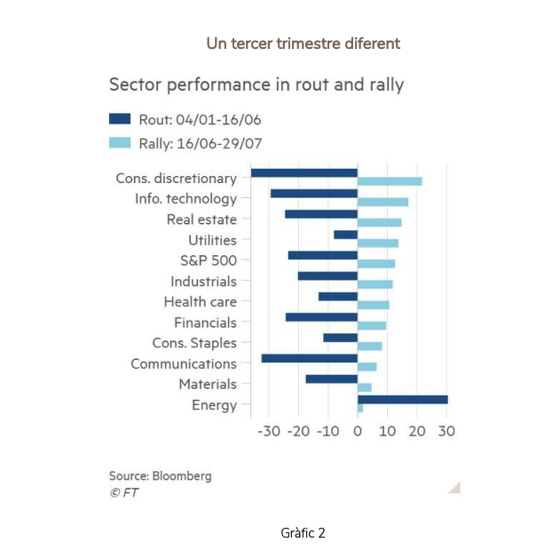 En el “Flash d’opinió” de finals d’agost vam parlar d’aquest fet i vam incloure el gràfic adjunt, que il·lustra com han afavorit els mercats sectors diferents en funció de les rotacions esmentades entre el 1S2022 i el 3T2022.