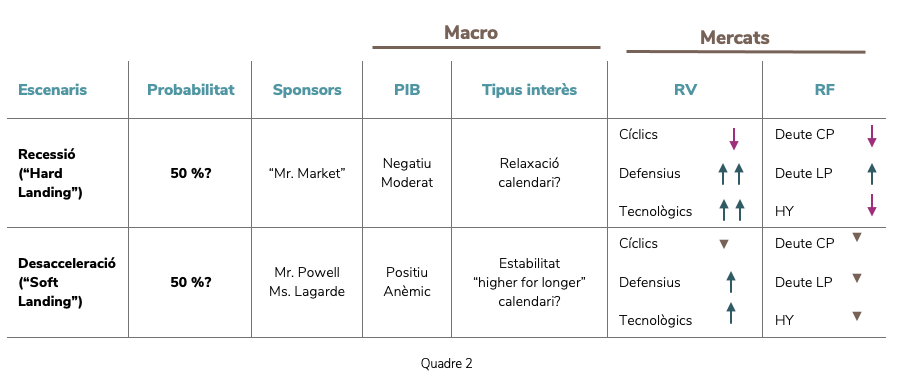 Segueix l’habitual incertesa macroeconòmica i la seva resposta pels Bancs Centrals, cosa que divideix economistes i inversors. El Quadre 2 pretén servir de marc per al final de 2023 i, sobretot el 2024 ja que sembla que el cicle s’allarga sense definir cap dels dos escenaris que es mostren en el Quadre.