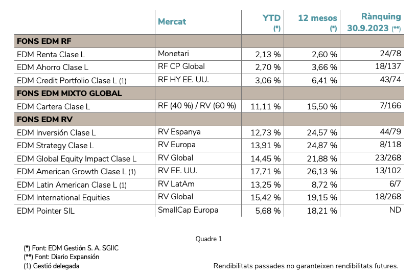 Dotze mesos després del mínim a les Borses (setembre 2022) els índexs borsaris han recuperat gran part de les caigudes de valoració registrades aleshores. Després del trimestre estival, que alguns denominen el període estúpid (“silly season”) els resultats dels fons EDM validen la confiança en la nostra selecció d’actius i el nostre escepticisme permanent respecte als qui diuen “saber” el que farà el mercat (veure Quadre 1).
