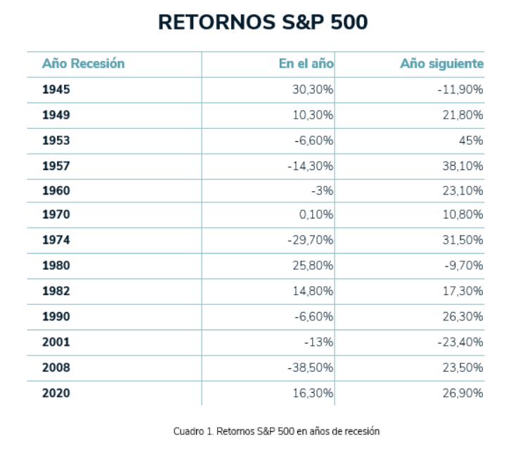 La gran crisi financera de 2008, segons el Fons Monetari Internacional va ser el major col·lapse econòmic i financer des de la gran depressió dels anys 30. Pel que no podem dir que va ser una recessió normal, encara que sigui la que més ben gravada tenim en les nostres ments. No obstant això, en els altres gràfics vists i en la taula que apareix a continuació, veiem com va evolucionar el S&P 500 en altres recessions, tant l'any que van succeir com en el pròxim.