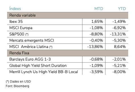 - Aquests moviments reverberen sobre tots els mercats, inclosos els de Renda Variable. El quadre recull el moviment dels índexs a la fi de mes.