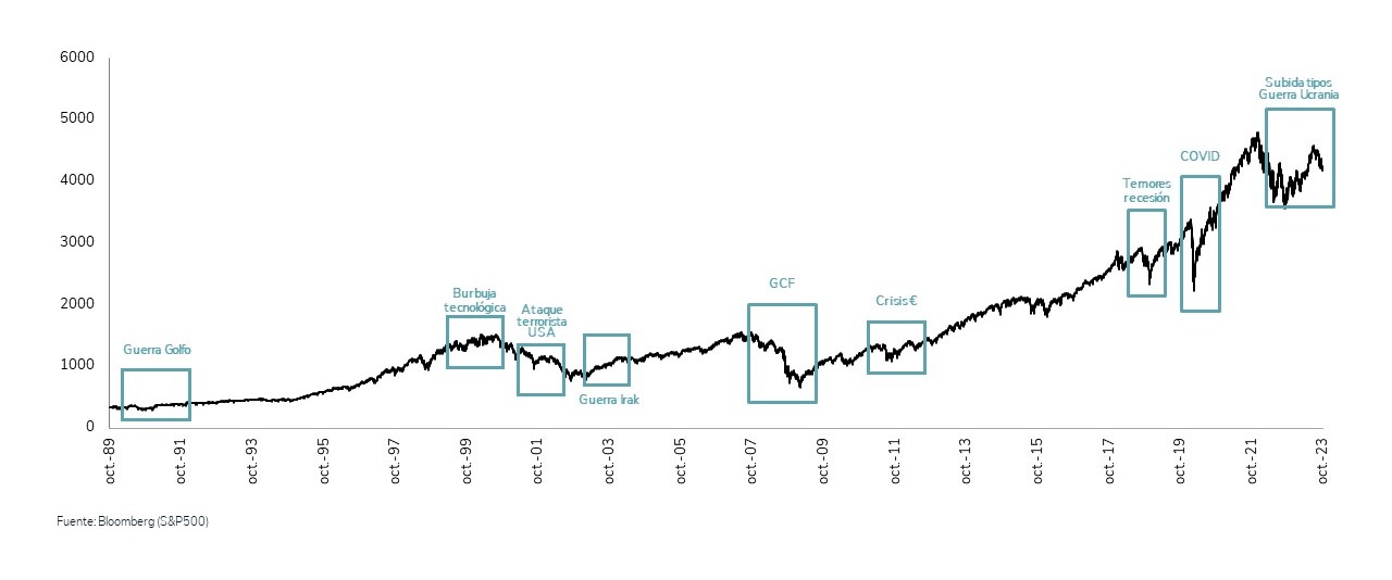 The previous graph illustrates the evolution of the S&P 500 from 1989 (the year EDM began managing investment funds) to October 2023. Often, with the emergence of a new crisis, distraction and emotion in the short term lead us to believe the world is ending. But when put into perspective, we can see that financial markets recover and ultimately generate value.