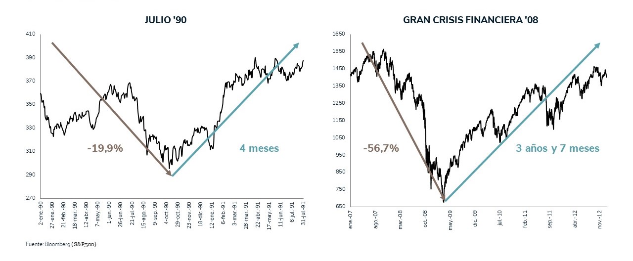 Two main trends are evident: i) recovery time is not always the same; normally, it is shorter; and ii) the returns. While often returns during the recession year are favourable, 77% of the time they are positive the following year — the Great Recession of 2008 being the exception, not the rule.