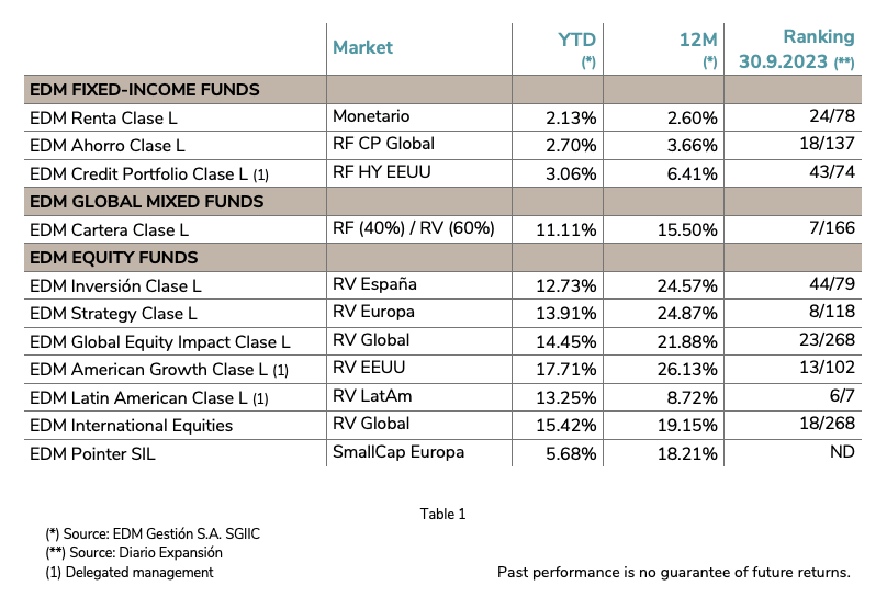 Twelve months after the stock market low of September 2022, indices have recovered the majority of valuation declines registered at the time. With the summer quarter—dubbed the “silly season” by some—behind us, the results of EDM’s funds corroborate our confidence in the assets selected and our unwavering scepticism of those who claim to “know” what the market will do (see Table 1).