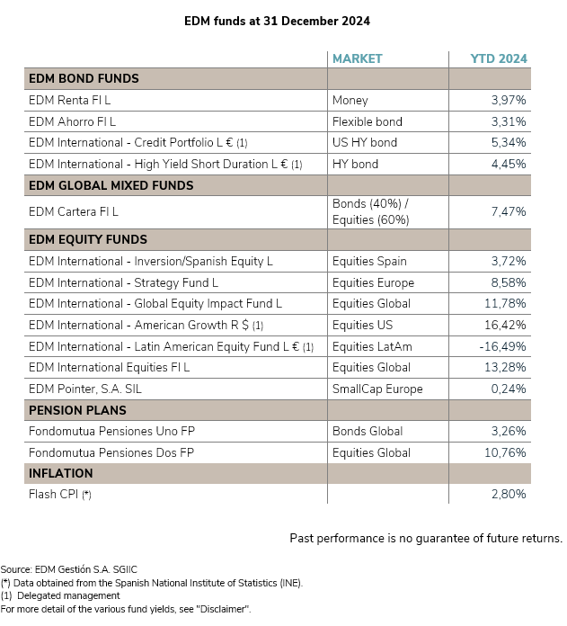 This letter’s Appendix details the results of the investment funds managed by EDM Asset Management (*) and those developed by EDM Wealth Management (*), whose management is delegated to third parties. (Note their performance relative to inflation.)