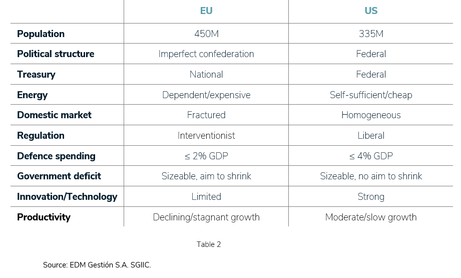 In recent months, the idea has spread that the US is blessed with several factors (see Table 2) that are absent in Europe, which is currently mired in existential reflection.