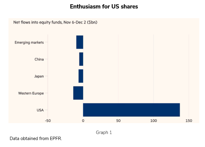 Donald Trump’s election has been received favourably by markets and with overwhelming optimism in the US, reflected by an extraordinary flow of investments (Graph 1) at the expense of the remaining stock markets in other geographical areas.