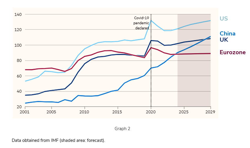 Our clients with the most experience in the investment world have shared their concerns about the sizeable levels of debt in developed countries, the trajectories of which are simply unsustainable (Graph 2).