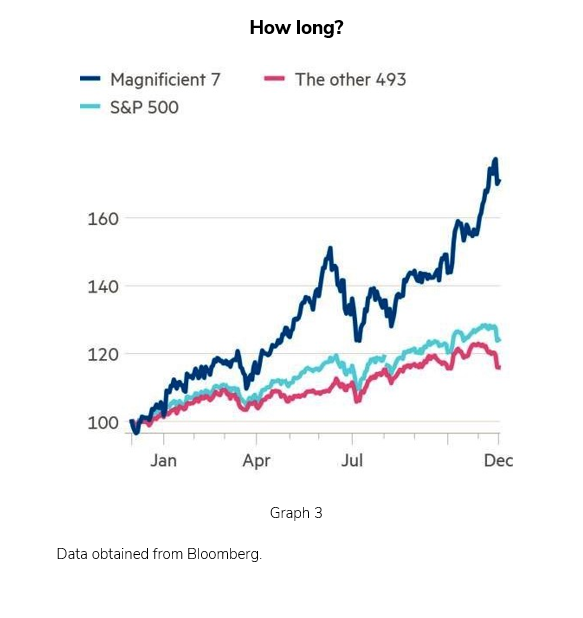 The shares of these seven US companies (1) represent 33% of the S&P 500’s capitalisation and 72% of its gains in 2024. This evolution reminds us of the 1970s, when the "Nifty Fifty" monopolised investor interest, before succumbing to two decades of lethargic performance after their meteoric rise.